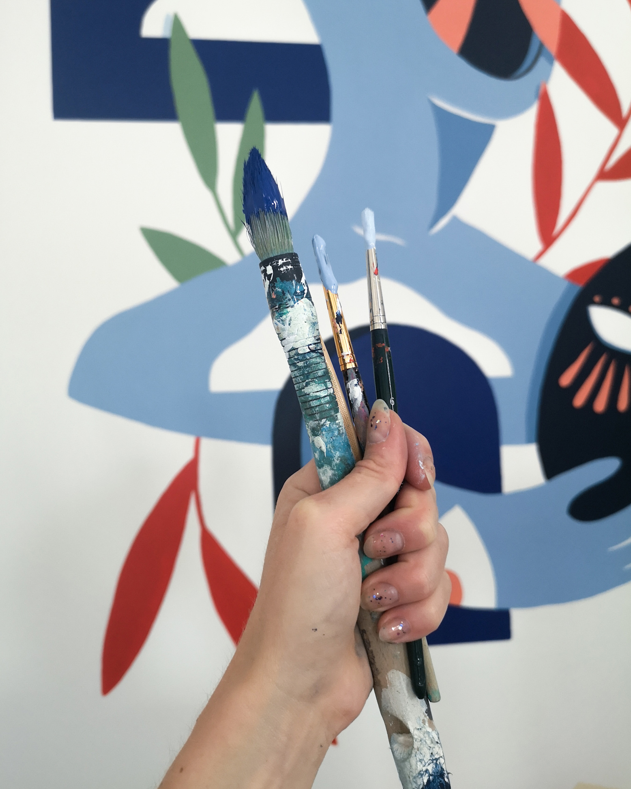 Iels m'ont contacté pour créer une image à peindre à même leur mur, visible dès l'entrée de leur appartement, jusque dans leur salon. La thématique du voyage,